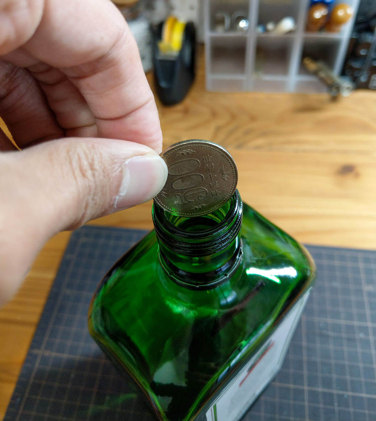 とりあえず注ぎ口から入るか確かめましたが、500円玉どころか1円玉すら入りませんでした。