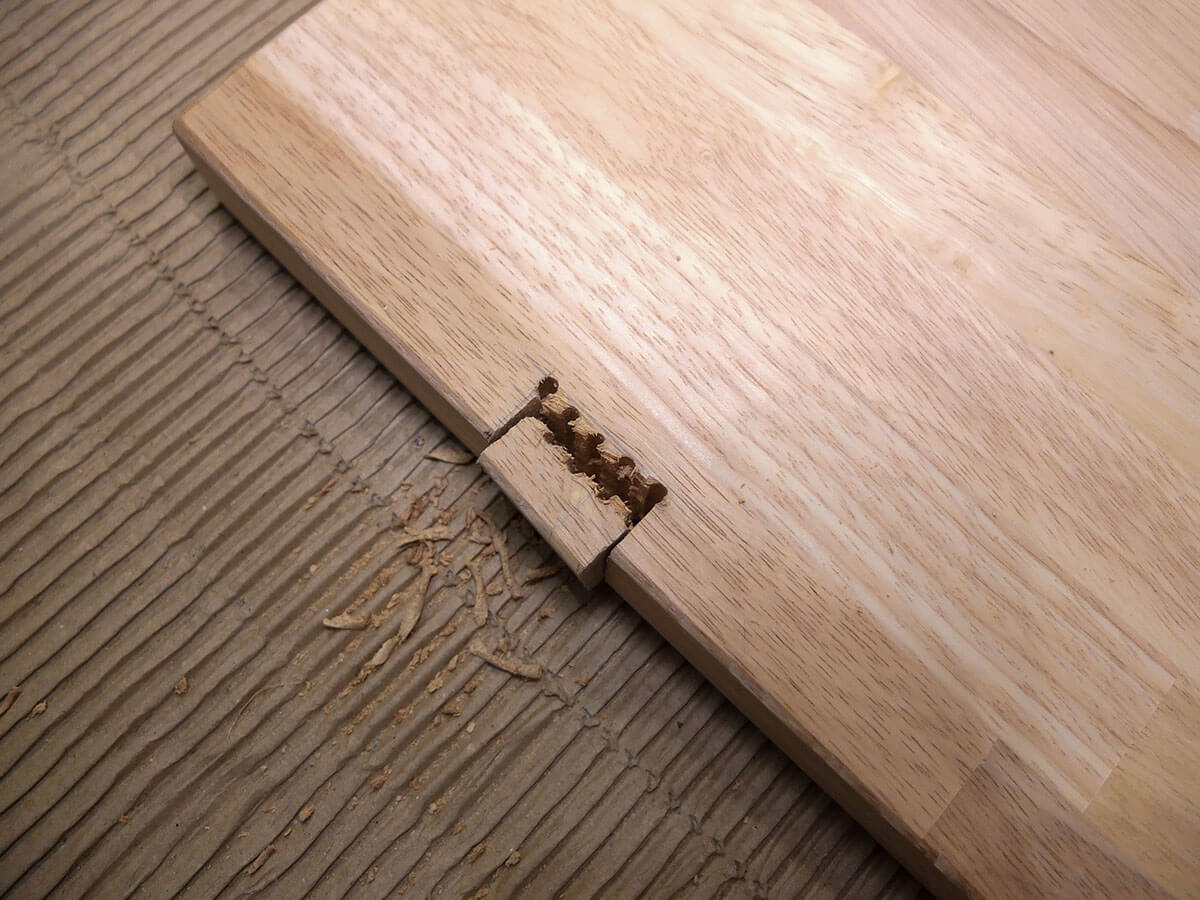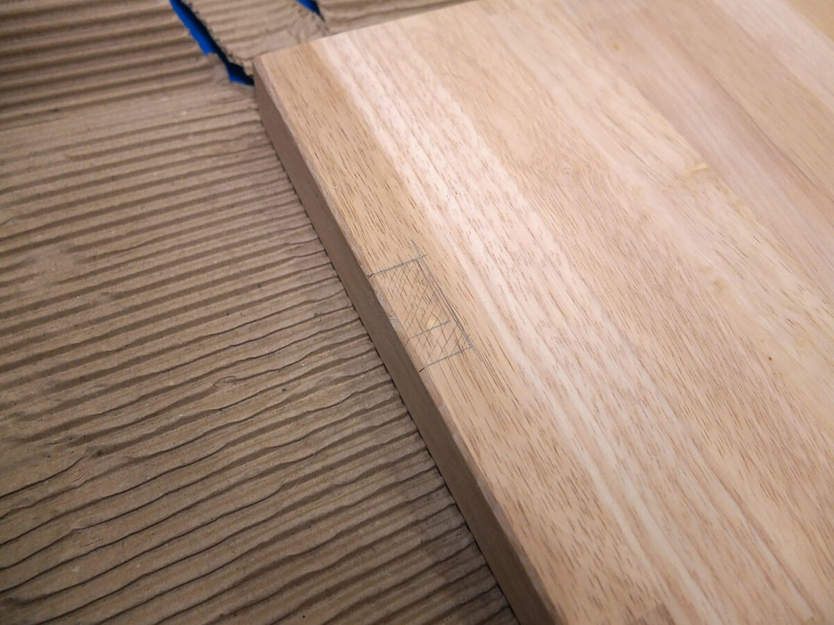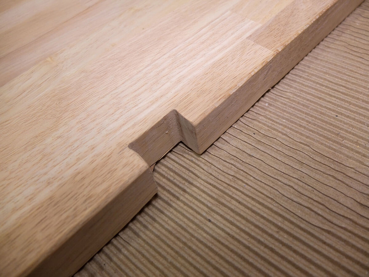 PCデスクなので必然的に電源ケーブルやらなにやらが多くなるので、天板奥にケーブルを通す用のくぼみを作ることにしました。