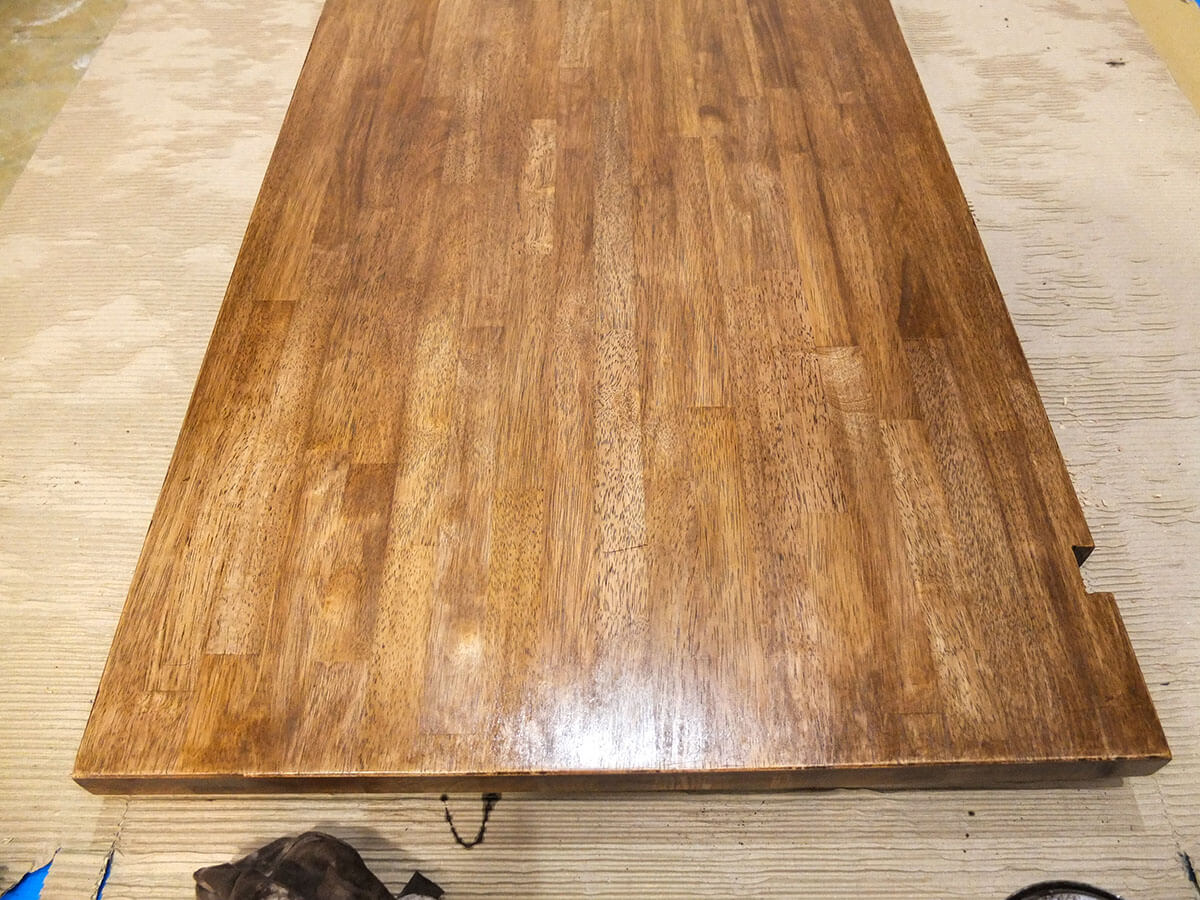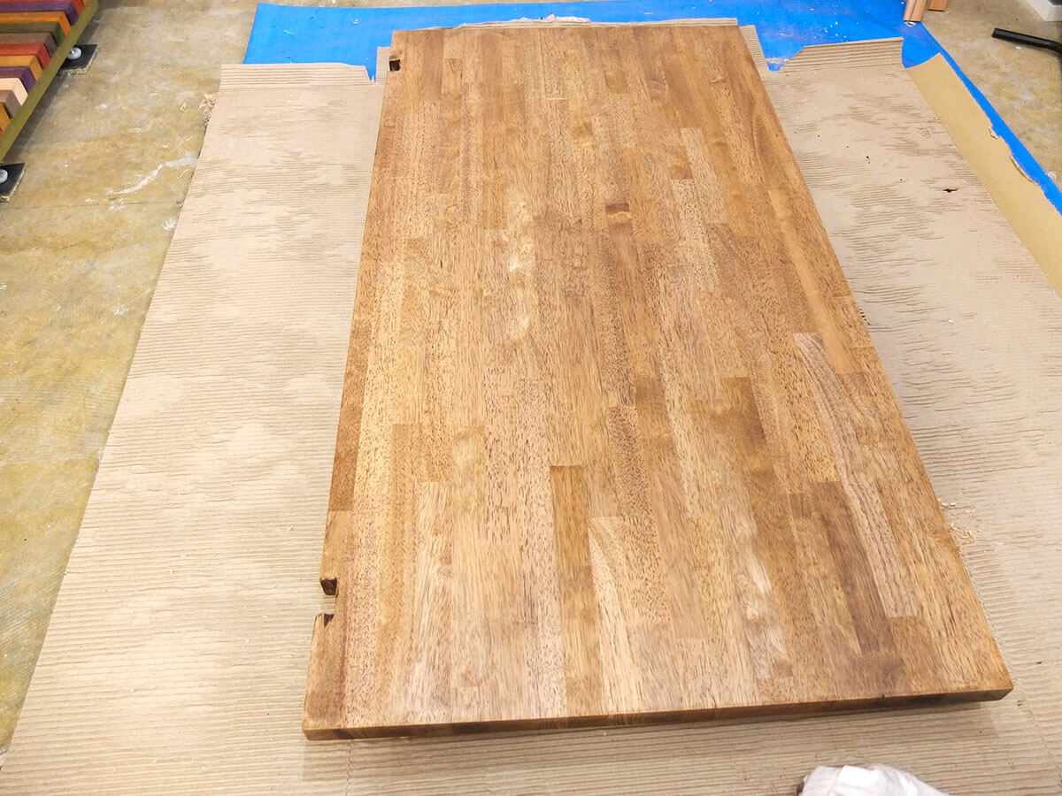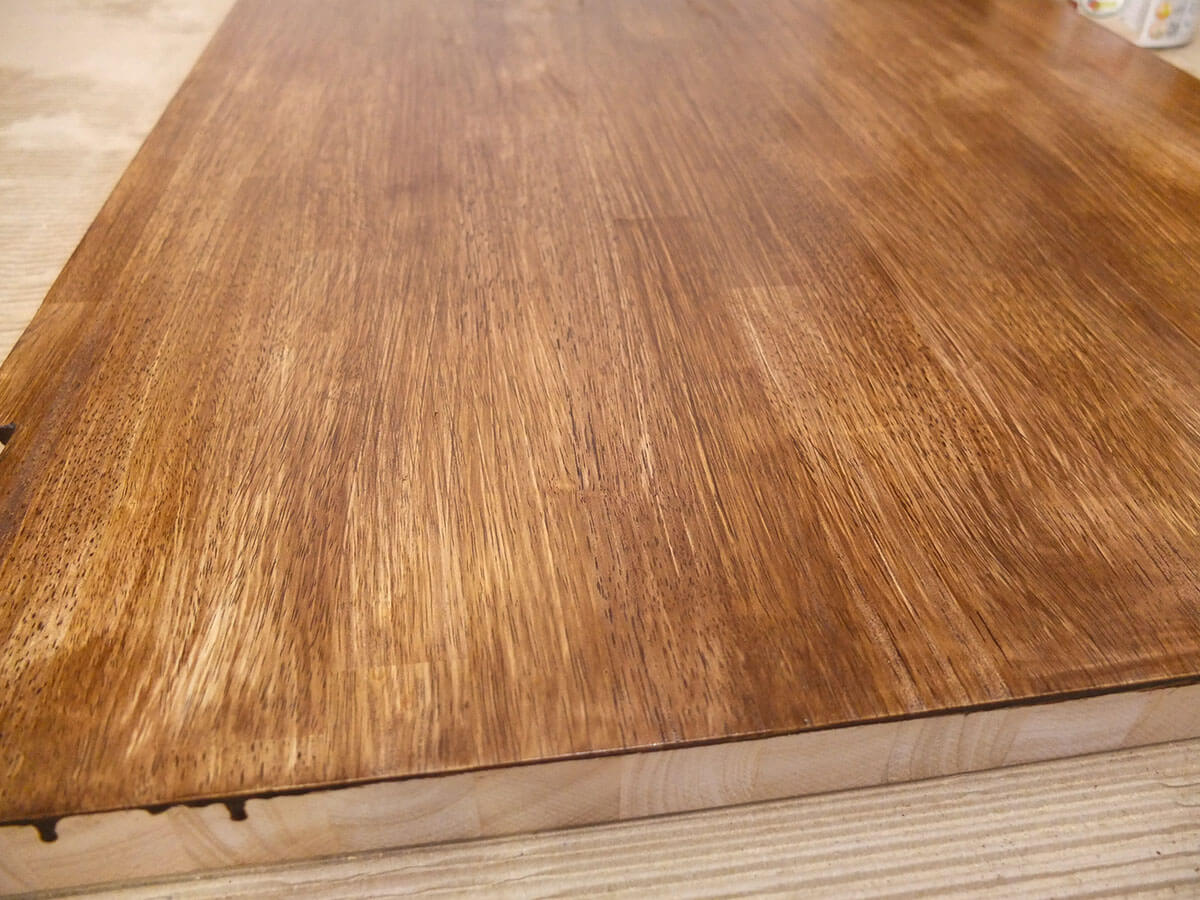 この天板は最初からある程度表面が整った状態だったので、軽く毛羽立った箇所だけヤスリがけしてから塗りました。