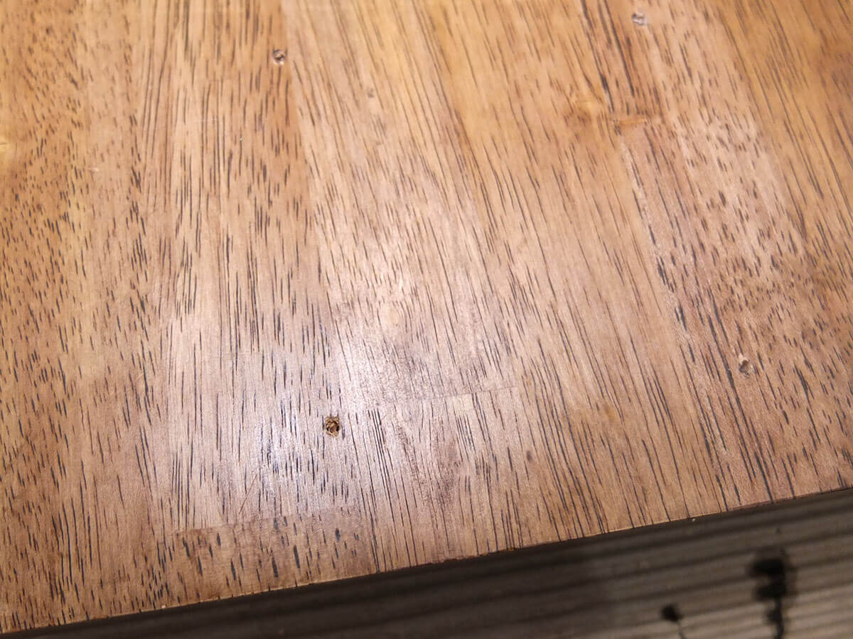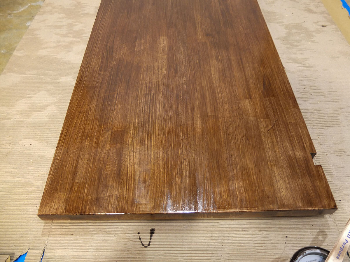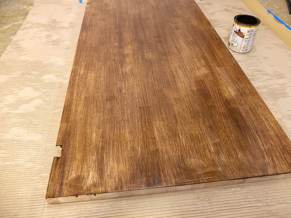 この天板は最初からある程度表面が整った状態だったので、軽く毛羽立った箇所だけヤスリがけしてから塗りました。