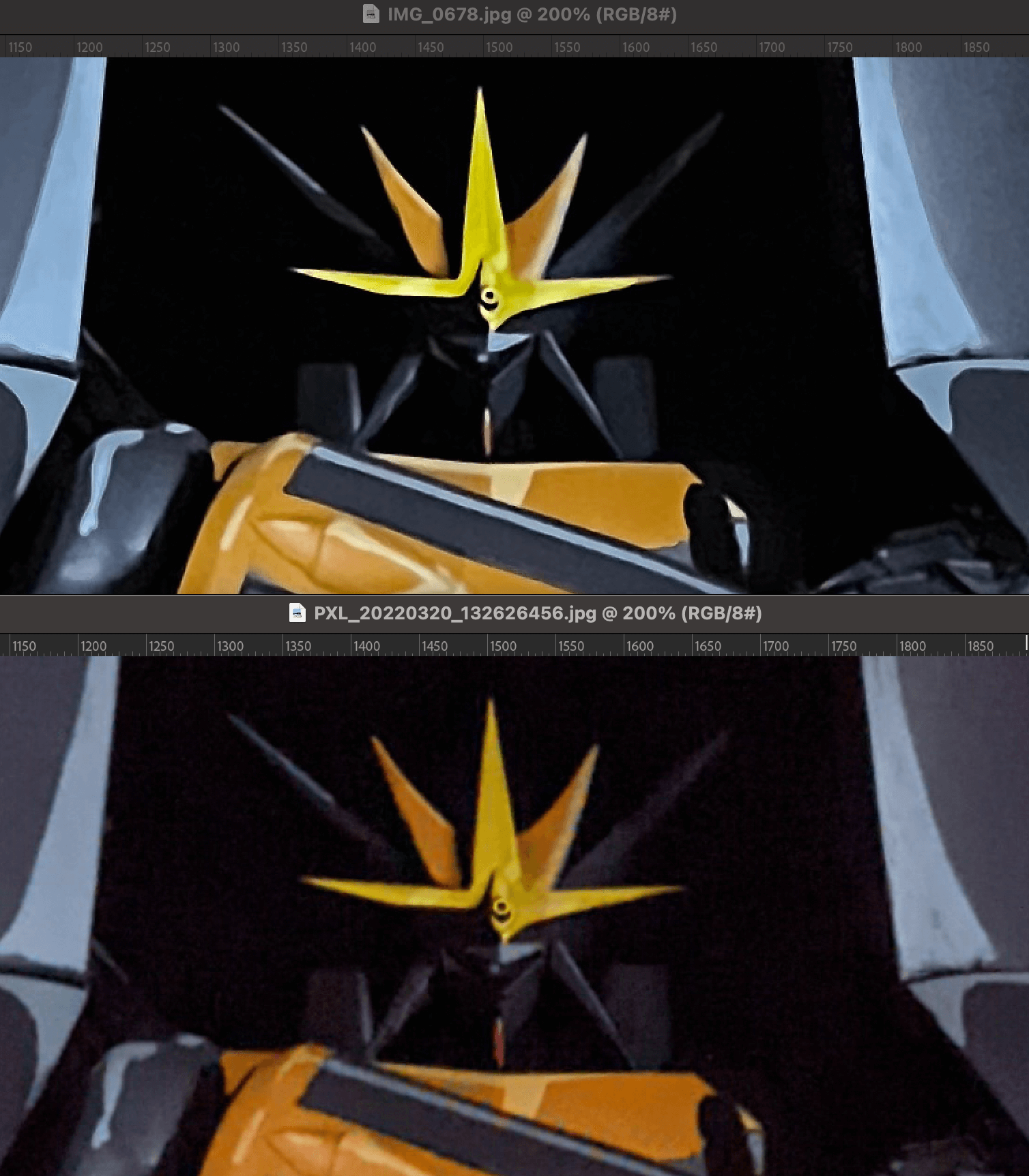 肉眼に近いのはiPhone13 proですが、黄色のプラモなのでPixel5の暖色系補正と相性が良いと感じます。
