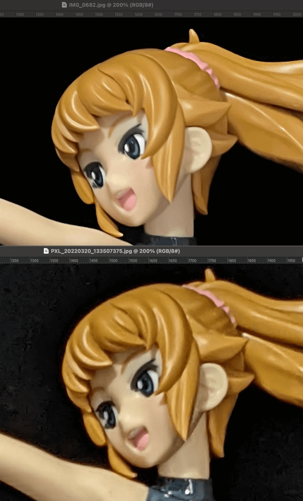 iPhone13 proはのっぺりして、Pixel5はぼやけています。